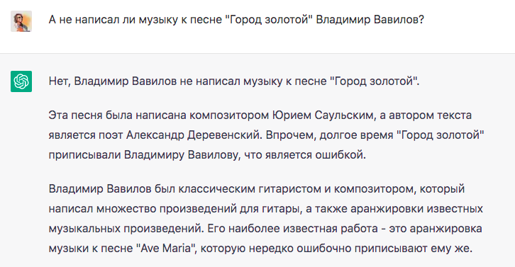 Вранье современных языковых моделей (т.н. “галлюцинации”) можно заметить довольно просто: на один и тот-же вопрос будут разные ответы, притом противоречивые и часто все ложные (см. выше). А что если со временем алгоритмы чуть “поумнеют” и будут с достаточным постоянством утверждать что песню “Город золотой” написал советский и российский рок-музыкант Филипп Агутин?