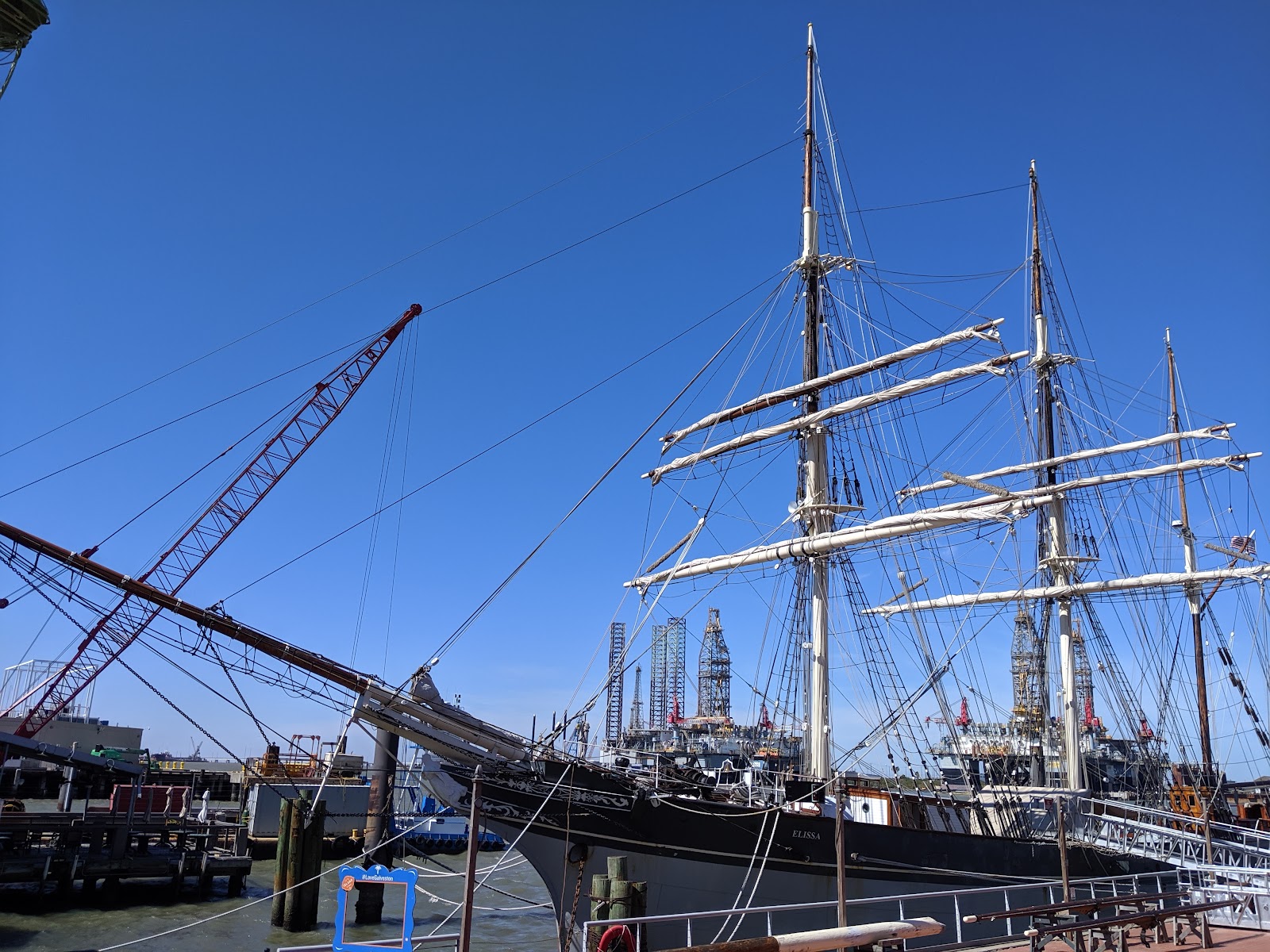 We are taking a walk around the old part of town — it’s not that bit — with a friend of mine who lives not far from here. Victorian style houses, waterfront with historic sailboat Elissa and a couple of modern days oil rigs with no names, Rosenberg library — oldest public library in Texas, still used for this purpose today.