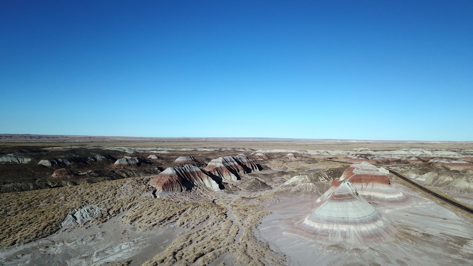 Landscapes and color change rapidly from red, brown and orange sandy hills to white and grey TP-like “structures”, the remnants of old mountains, with layers of black and yellow. Blue Arizona sky completes the picture perfectly. It’s endless!