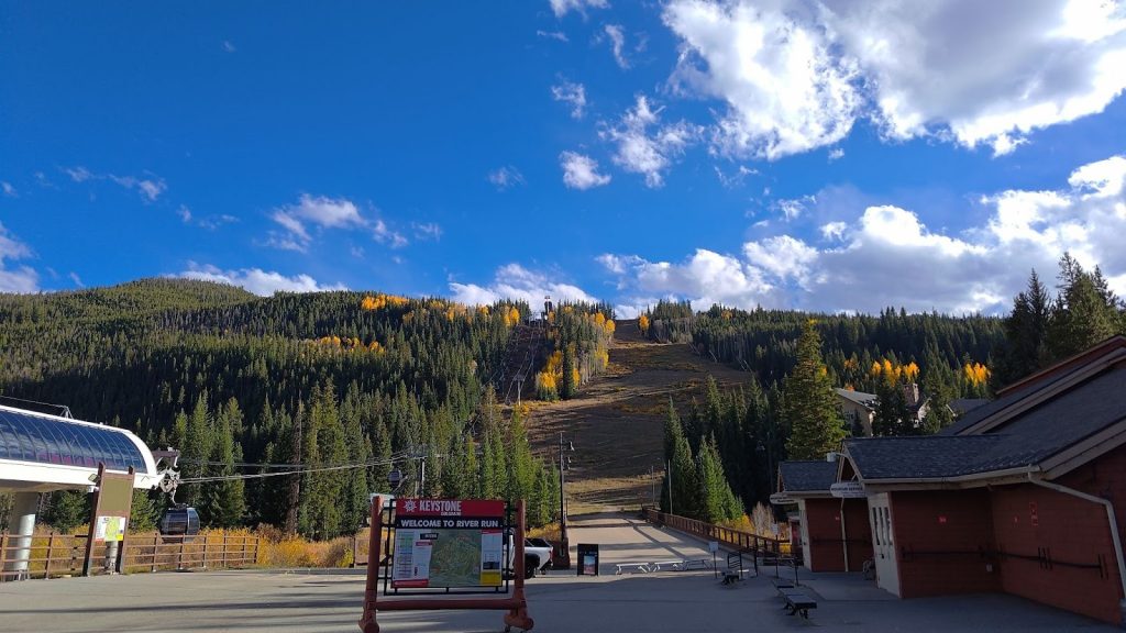 А вот и наш излюбленный лыжный курорт Keystone. Осенью все здесь выглядит по-другому. Можно сказать «мертвый сезон». Ни на горе ни в «деревне» почти никого нет. То ли лыжники не едут .. Цвета на крутых склонах контрастные, темно-зеленые, коричневые, изредка желтые. Лиственных деревьев на этих высотах — не густо. Непривычно конечно без снега.