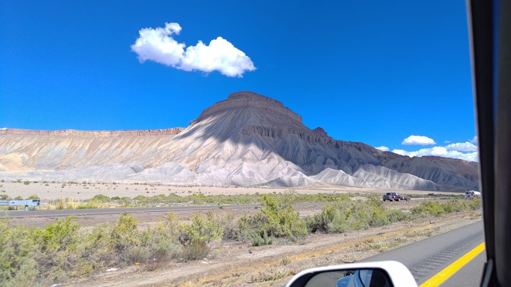 Пепельные холмы в предгорьях на западной кромке штата перемежаются равнинами. Иногда есть впечатление что какой-то добрый гигант насыпал песка сероватых оттенков из больших чаш в разные места и в разных количествах. Он старался быть оригинальным иногда добавляя в чашу чисто белого материала. Я раньше видел такое в стеклянных сосудах в сувенирных магазинах.