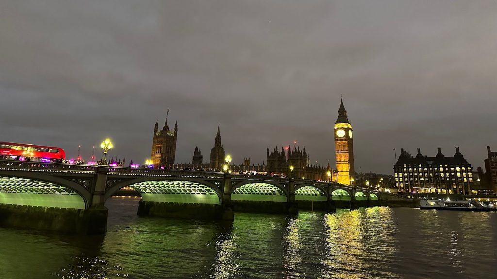 Цветовая гамма как нельзя более передает выборации и энергетику: нависшие серые облака, коричнывые каменные башни, огни, мост, холодная река Темза, влажноватый почти туманный воздух, мост, красный двухэтажный автобус …