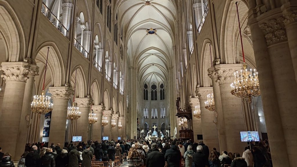 Парижской. Богоматери. Собор, который не так давно горел и сейчас заново отстраивается. Уже вечереет и кругом огни. Вход скоро закроют, но похоже мы успеваем. Тем более он недалеко от метро на вокзальной линии. Учреждение христианского культа бесплатно для посетителей.