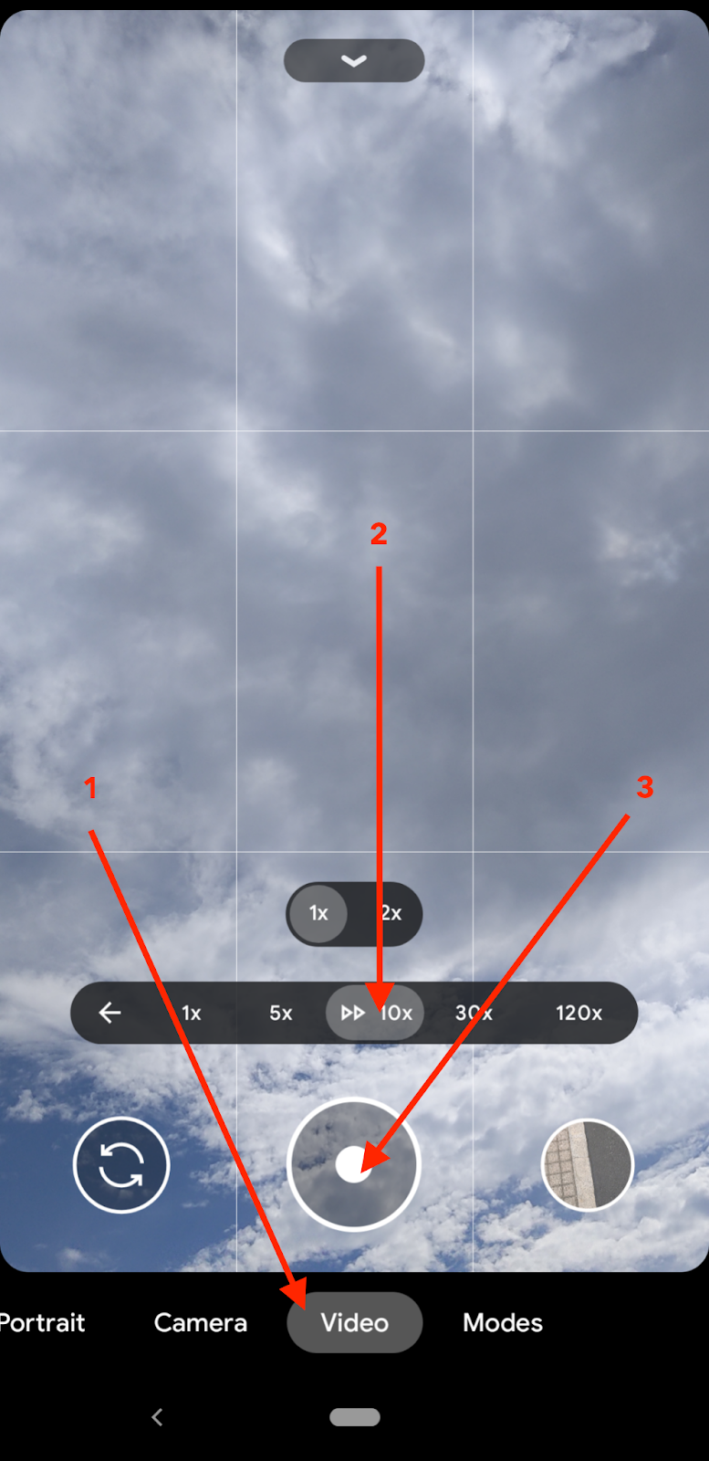 • Включите телефон на запись в режиме Покадровое Видео / Time-Lapse со скоростью 1:10x, каждый кадр через 10 секунд;