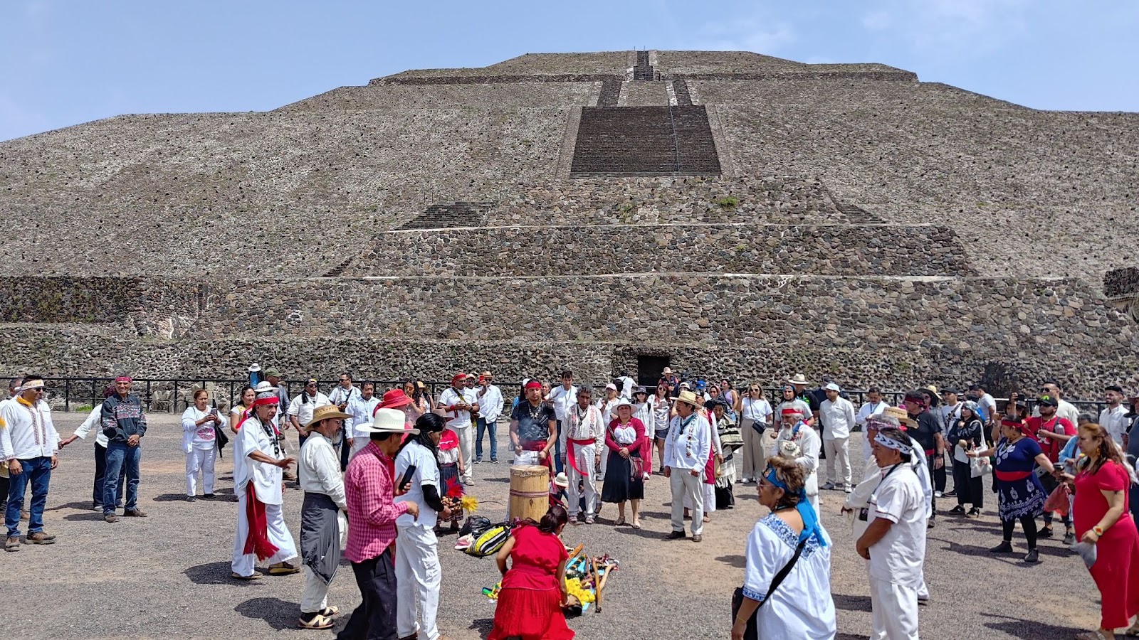 На площади этой, названной позднее Ацтеками как «улица мертвецов» в память о всех ушедших, довелось нам увидеть зрелищное представление современных потомков теотиуаканцев — с барабанным боем, песнями и танцами. Как оказалось, это вовсе не для туристов. Просто нам повезло и в этот день случилось весеннее солнцестояние когда день равен ночи, а это их древний праздник.