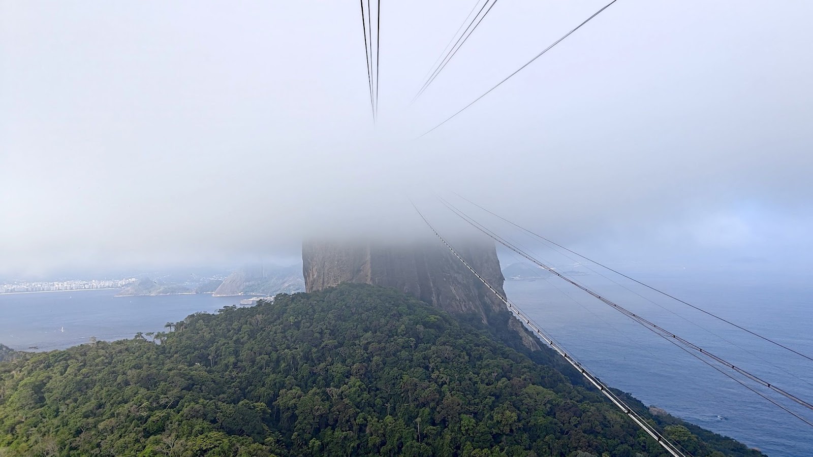 Идем туда! Точнее, покупаем билеты и едем. На самом деле горы тут две. Одна — промежуточная, так сказать, «первая ступень», куда проходят канаты. А оттуда уже на сам «батон». Все бы ничего, но на такой высоте случаются облака и в этот день природа Бразилии, у которой нет плохой погоды, нам их как раз и подарила.